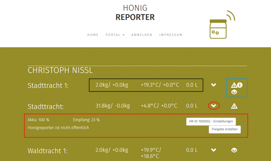 Im Eingangsbereich, bzw. bei mein Meine Honigreporter wird eine Übersicht über alle zugeordneten Stockwaagen angezeigt. Auf einen Blick werden alle wichtigen Daten dargestellt: